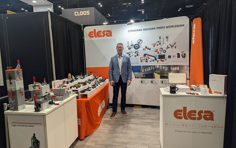 The Elesa booth filled with a range of clamping, handling, safety, and sensing devices. Image used courtesy of Elesa USA via social media