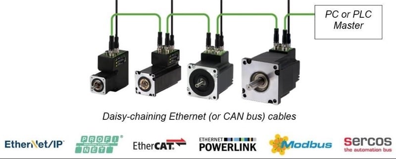 Built-in Ethernet switching allows MAC motors to be daisy-chained for multi-axis systems using protocols such as EtherCAT, EtherNet/IP, Profinet, Powerlink, Modbus TCP, and SERCOS. Image used courtesy of JVL
