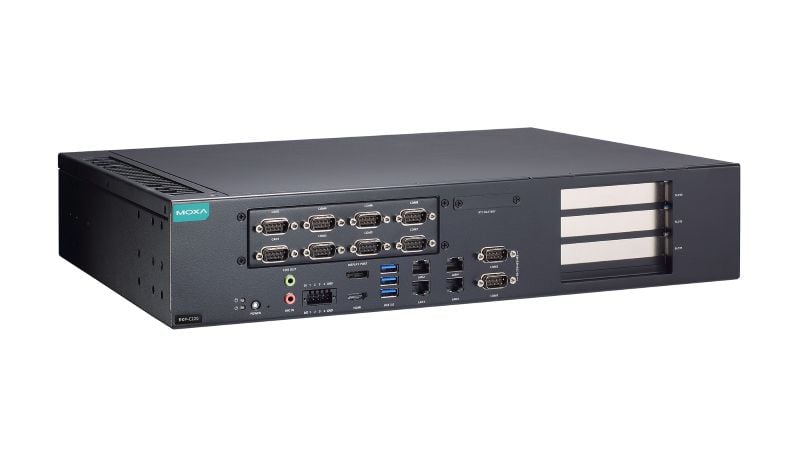 The RKP-C220 IPC is available with eight LAN ports, 10 serial ports, and two CAN ports. Image used courtesy of Moxa