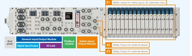 A typical installation of a pneumatic valve bank on a machine will require a constant 24 V DC source and a switchable 24 V DC power source. This switched power is routed through a set of safety relays that are energized with a safety output, and the state of the relays is monitored with the safety inputs. This topology requires extensive wiring and cabling from the main panel to all valve banks on the equipment.