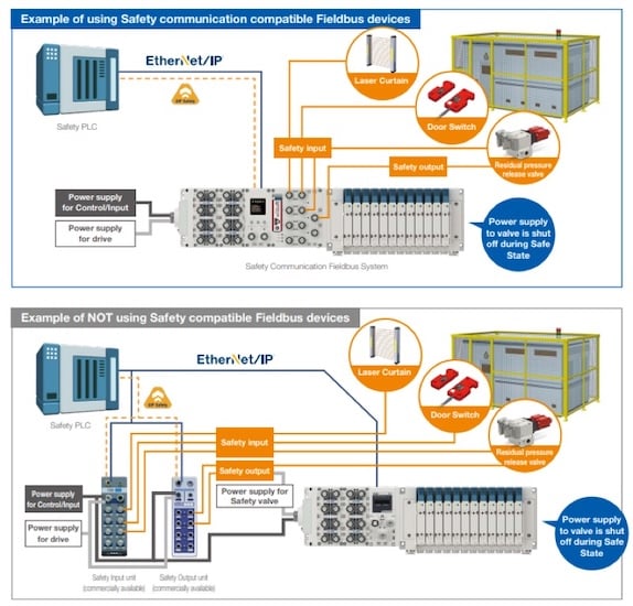 Two systems, one using conventional safety I/O and the other using the EX600 safety I/O. Image used courtesy of SMC