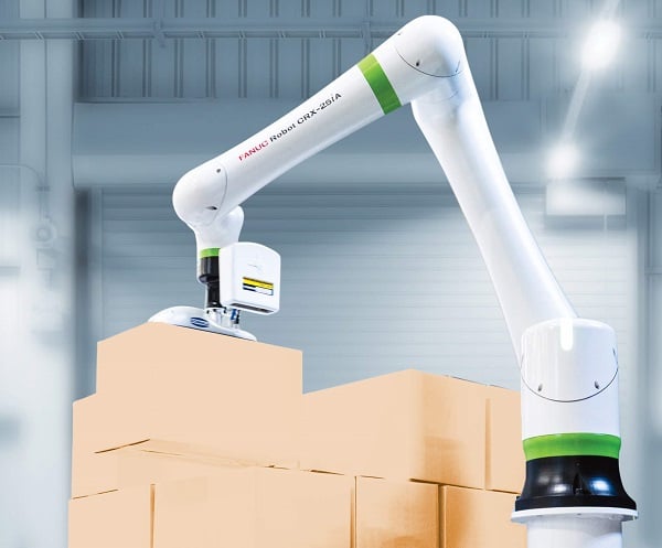 FANUC’s new CRX-25iA is in the middle of a palletizing operation. Image used courtesy of FANUC