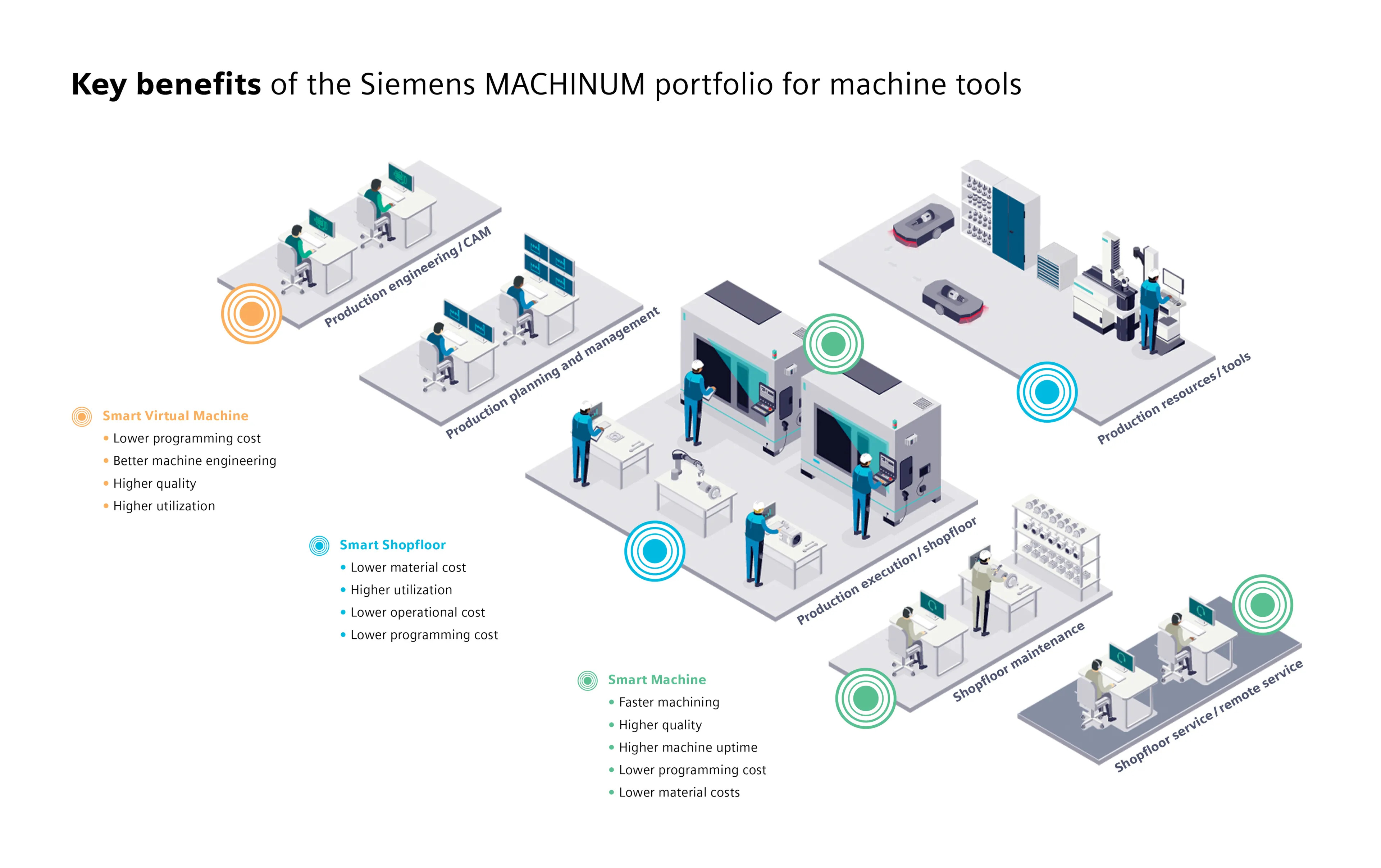 Siemens’ new MACHINUM portfolio consists of Smart Machine, Smart Shopfloor, and Smart Virtual Machine (click to enlarge). Image used courtesy of Siemens