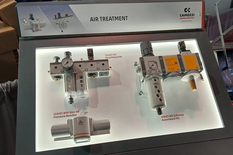 Camozzi exhibited its range of electromechanical cylinders and driver modules, along with proportional regulators and air treatment components, including pressure regulators, relief valves, and filtration systems, along with valve islands integrated with diagnostic software for predictive maintenance.