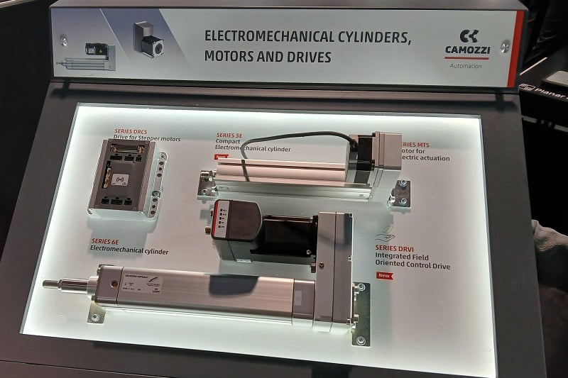 Camozzi demonstrated the DRVI field-oriented control (FOC) drive units sending commands to the electromechanical cylinder to show smooth, repeatable motion. This precision in control comes with a greater cost compared to pneumatic systems, but if the precise motion is required, Camozzi’s product catalog almost certainly contains the necessary specs.